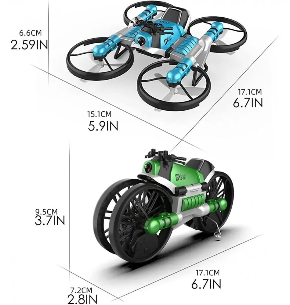 Deze bijzondere opvouwbare RC-Drone is een 2 in 1 drone. Deze drone kun je omvouwen naar een motorfiets, hoe gaaf is dat?!