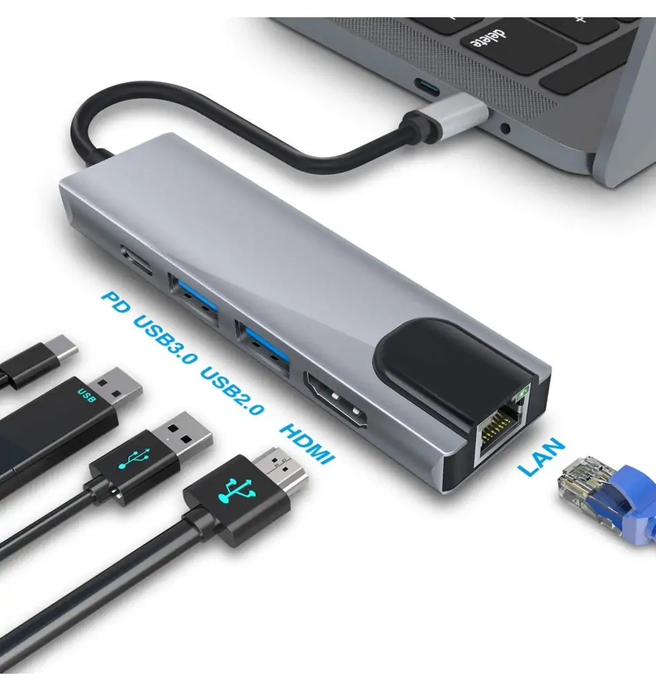 5-in-1 multifunctioneel, 5,3 inch (13,5 cm) lengte: dit product is voorzien van 4K @ (3840 x 2160P) 30Hz HDMI-poort, 1 Power Delivery-compatibele Type-C-poort, 1 Ethernet LAN-poort, 2 USB 3.0-poorten. De ideale lengte van 13,5 cm betekent dat u zich geen zorgen hoeft te maken dat de kabel te lang is om te saai of te kort te zijn om te gebruiken.